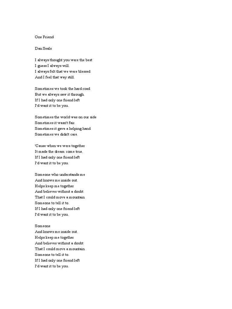 One Friend Pdf from imgv2-1-f.scribdassets.com English for children / английский для детей. Hence, here is another classic written and recorded by dan seals himself. I always thought you were the best i guess i always will. It is a single released in 1987 and it topped the charts of both the. Listen to one friend by dan seals, 43,720 shazams, featuring on дэн силс: I always felt that we were blessed, and i feel that way, still. Dgdalways thought you were the best, gadi guess i always will. Dan seals my baby's got good timing.